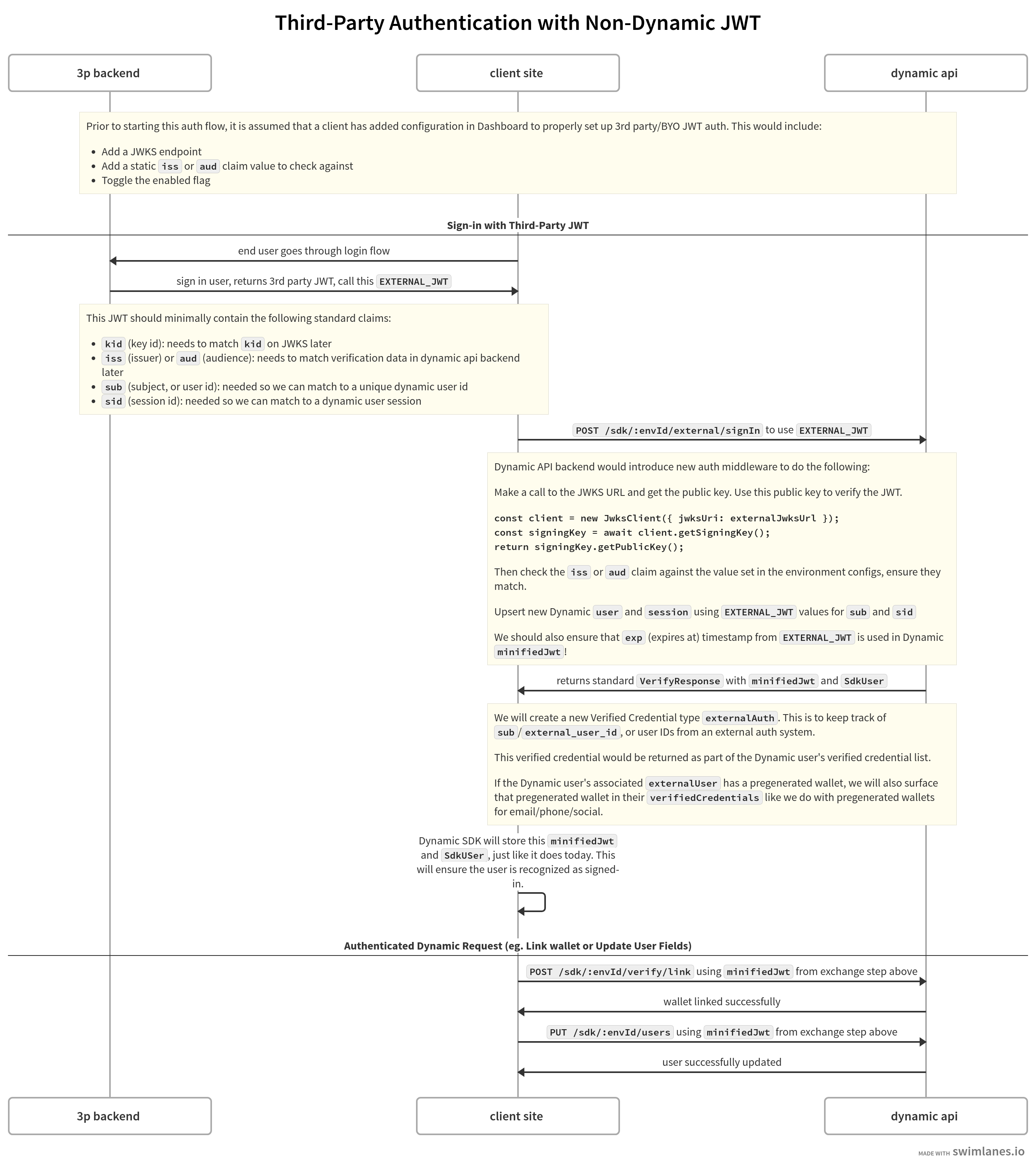 exp(expires at) JWT claim from external JWT. Dynamic will ensure that thisexpclaim is respected with timeouts on the SDK. - Once signed in using this external JWT, we will create an new verified credential of type
