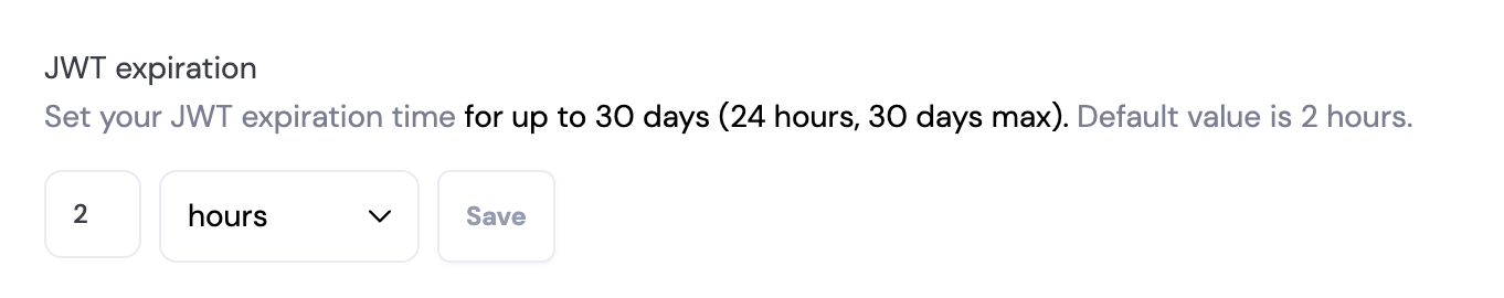 In the security settings page, you can update the expiration date of the JWT token. The expiration time is the amount of time before one of your customers will need to sign to log in. To update this expiration time, navigate to Settings > Security in the dashboard. Enter the amount of time in Day, Weeks, Months for the expiration time.